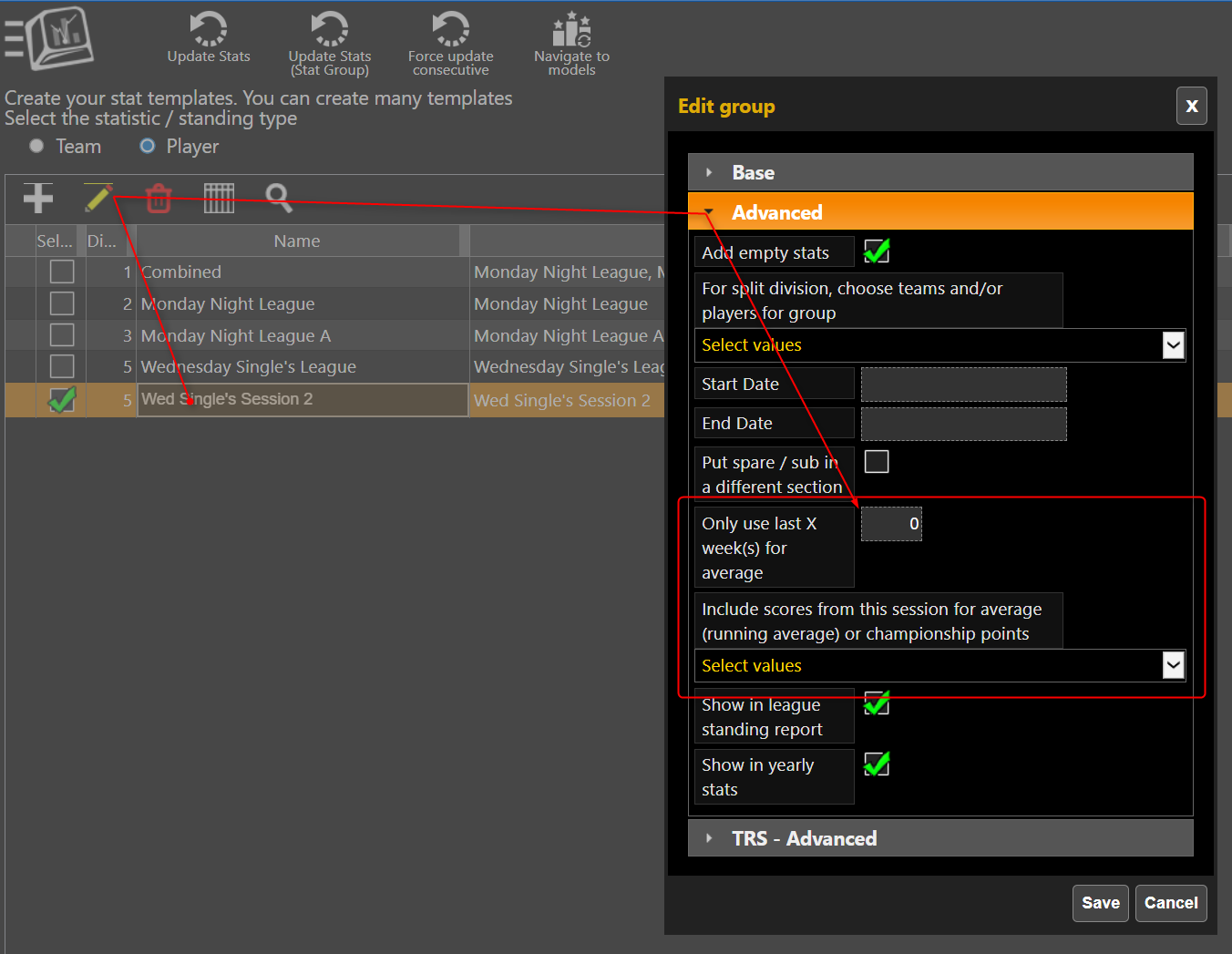 Select the league, Pencil, Advanced Section, Fill in how many weeks you want to use, and select the previous sessions you want to use.