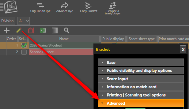 If you want players to be able to scan a barcode to registration for a Sport, Redemption or Resurrection division you need to go to Menu > Manage > Brackets/Round-Robins > Bracket Lines and Race to.