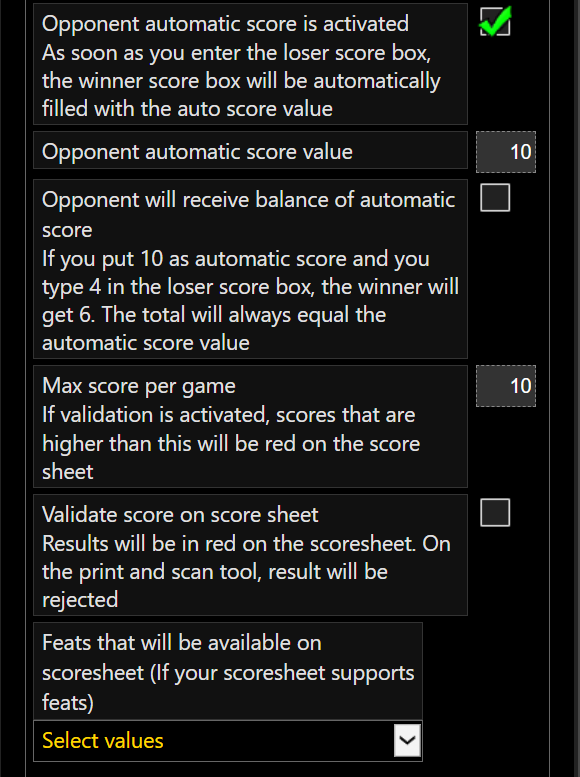 English: If you put 10 as automatic score and you type 4 in the loser score box, the winner will get 6. The total will always equal the automatic score value